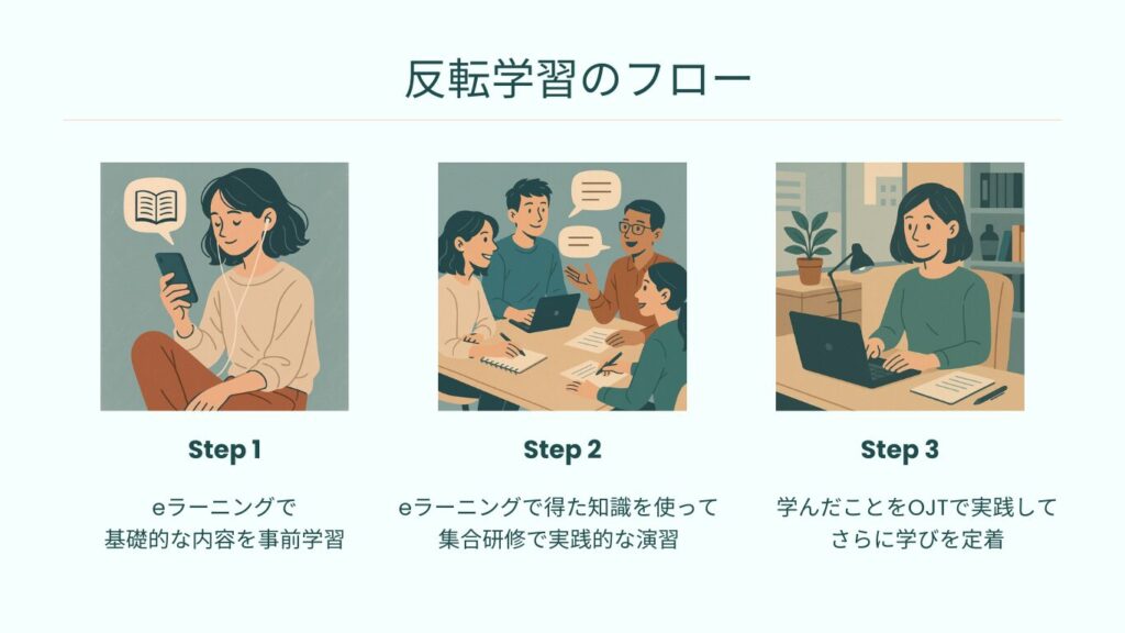 具体的には、知識のインプット(基礎学習)をeラーニングで事前に行い、集合研修ではその知識を応用したディスカッションやグループワーク、実践演習に時間を集中させるというものです。