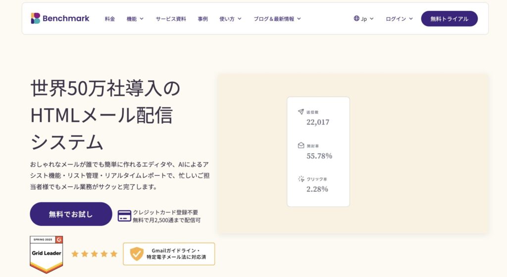 「Benchmark Email」は、世界50万社以上で利用されているグローバルなメール配信サービスで、デザイン性の高さと先進的な機能が魅力です。