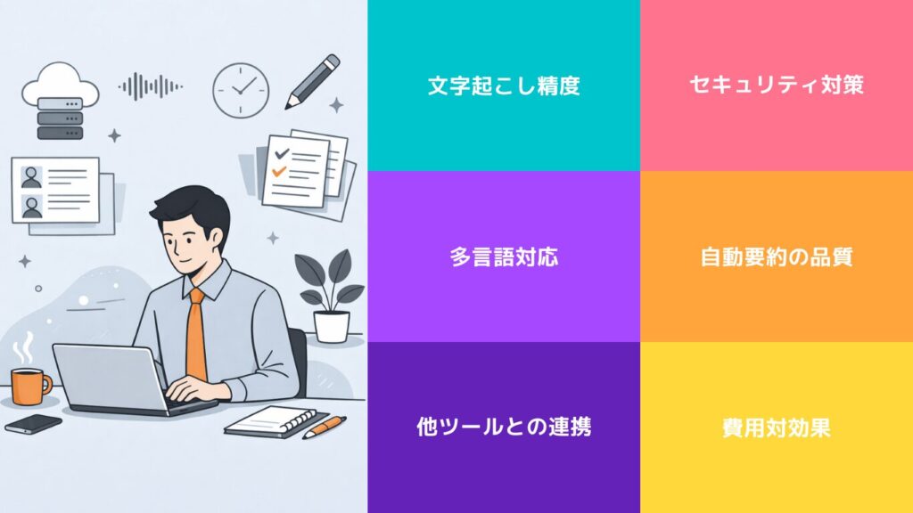 決定事項、ToDoリスト、質疑応答などを自動で整理してくれるか、また、要約の形式を自社のフォーマットに合わせてカスタマイズできるか、といった点も選定の重要なポイントになります。