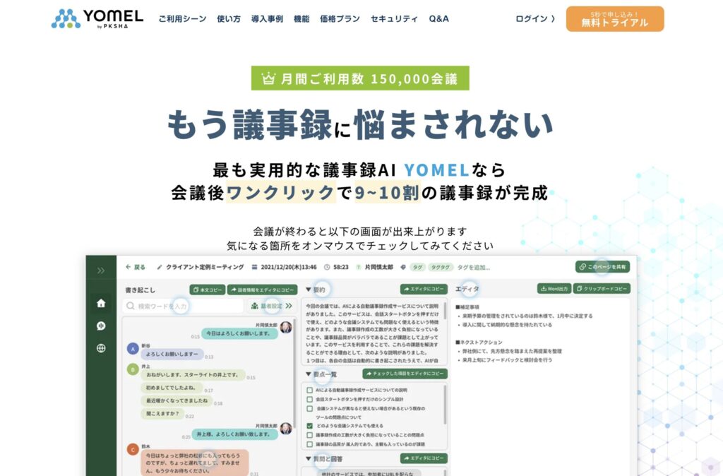 | 特徴 | 各種Web会議ツールとの連携が可能。議事録の自動清書・要約機能つき。 |
