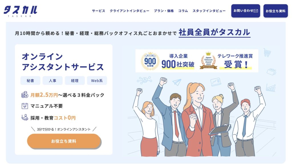 タスカルは、年間プランなら月10時間・2.75万円(税込)からという業界最安水準の価格設定が最大の魅力です。