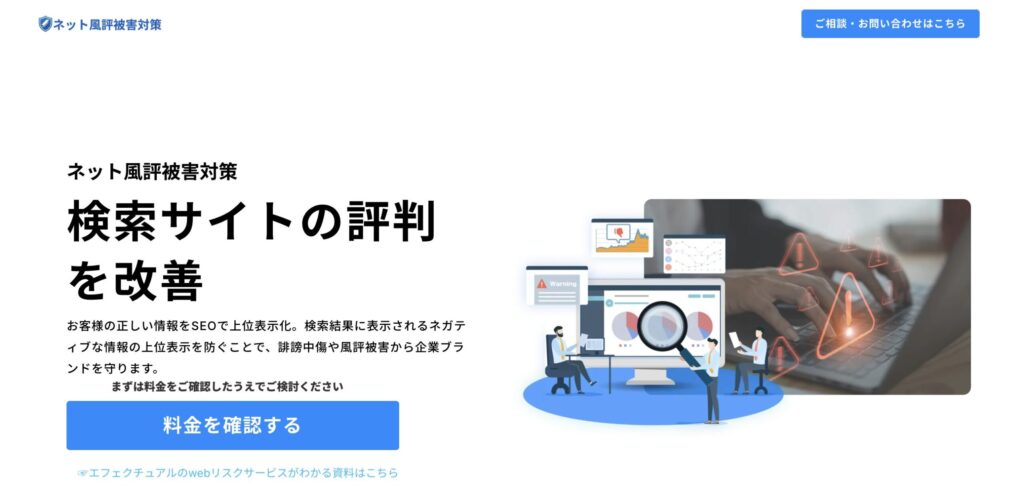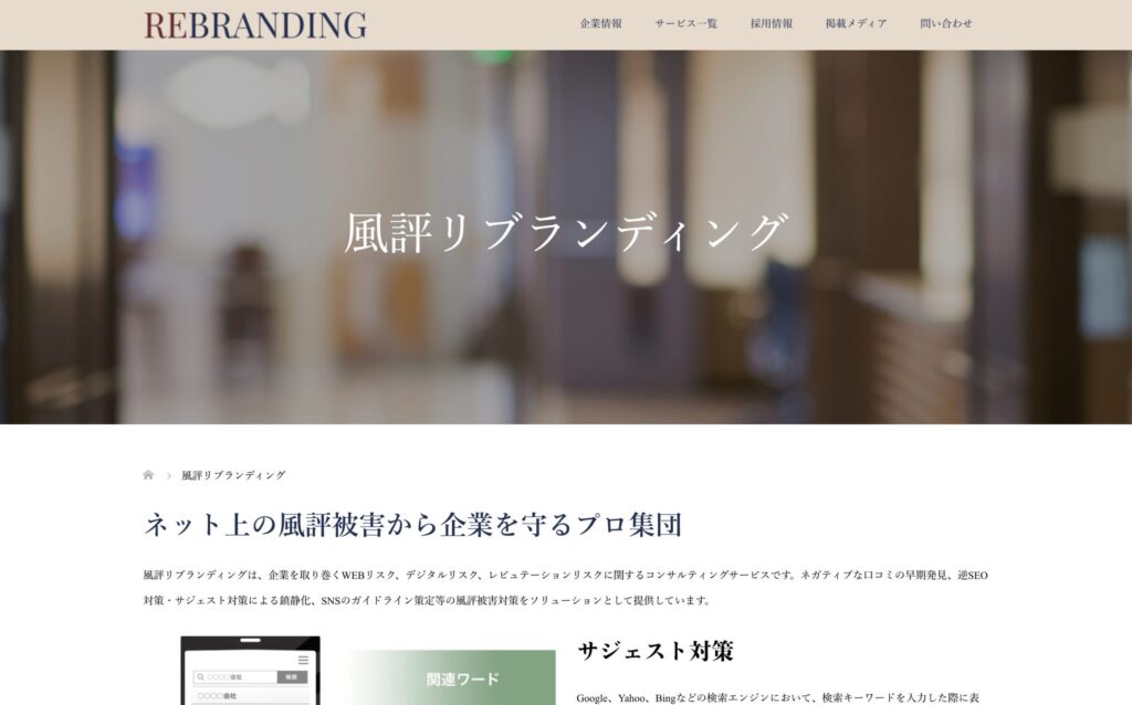 | 特徴 | ・自社開発のWebリスクモニタリングツール「WEBリスク クラウド」で施策効果を可視化 ・鎮静化から信頼性回復までワンストップで対応 ・逆SEO対策やサジェスト対策が強み |