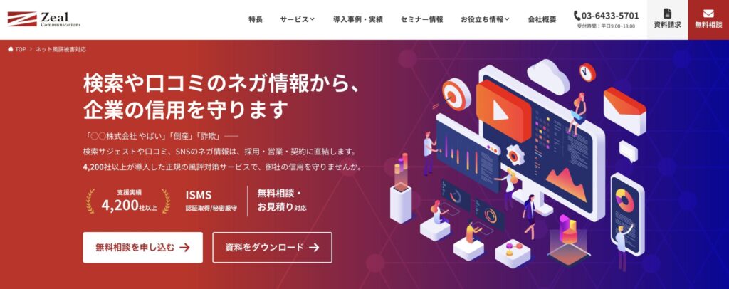 ジールコミュニケーションズは、風評被害への対処にとどまらず、口コミ基盤の改善、情報発信力の強化、再発防止策の構築までを一貫して支援する総合的なレピュテーション対策企業です。