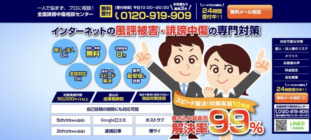 | 特徴 | ・各種ブログサイト・5ちゃんねる・食べログなど幅広いサイトに対応 ・最短即日で対策開始 ・成果報酬型で安心 |