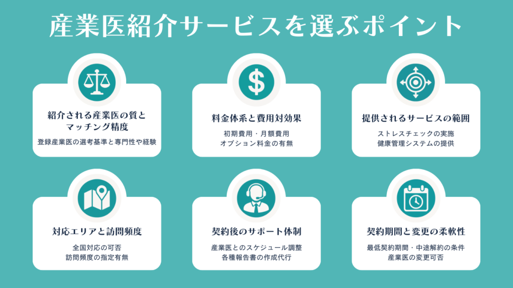 産業医の紹介だけでなく、どのような付加価値サービスが提供されるかも重要な選定基準です。