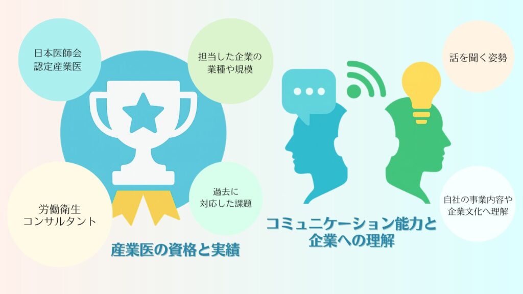 産業医としての資格はもちろん、メンタルヘルス、過重労働対策、特定の業界知識など、自社の課題に合った専門性や経験を持っているかを確認しましょう。