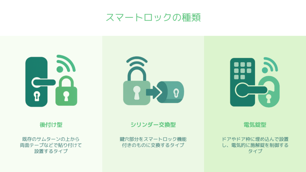 法人向けスマートロックは、設置方法によって大きく3つのタイプに分類されます。