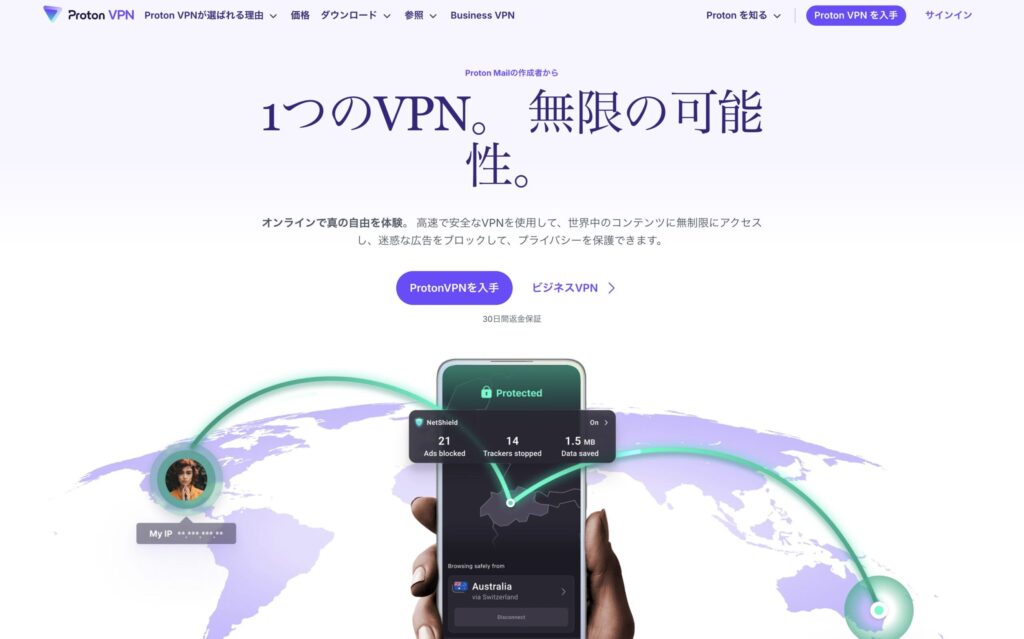 暗号化メール「ProtonMail」で知られるスイス企業が開発した、セキュリティとプライバシー保護を最優先に設計されたVPNです。